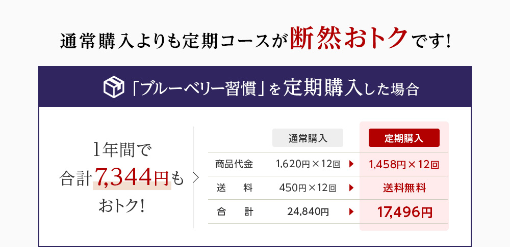 但し、現在自然食研の定期コースに加入中のお客様はその限りではありません。 - ※割引率は「ブルーベリー習慣(30粒)」単品購入価格(1,620円)との比較です。